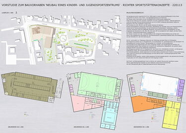 Der Neubau sollte ursprünglich nur auf einem Grundstück als Einfeldhalle mit Bewegungszentrum konzipiert werden. Aufgrund der geänderten Bedarfe wurden wir mit einer Studie zur Ausarbeitung eines neuen Standortkonzeptes beauftragt. Das Kinder- und Jugendsportzentrum soll aus einer Zweifach-Sporthalle, ein Bewegungszentrum, ein Therapie- und Bewegungsbad und aus einer Tiefgarage bestehen. Eine Überplanung der angrenzenden Grundstücke war somit unerlässlich.